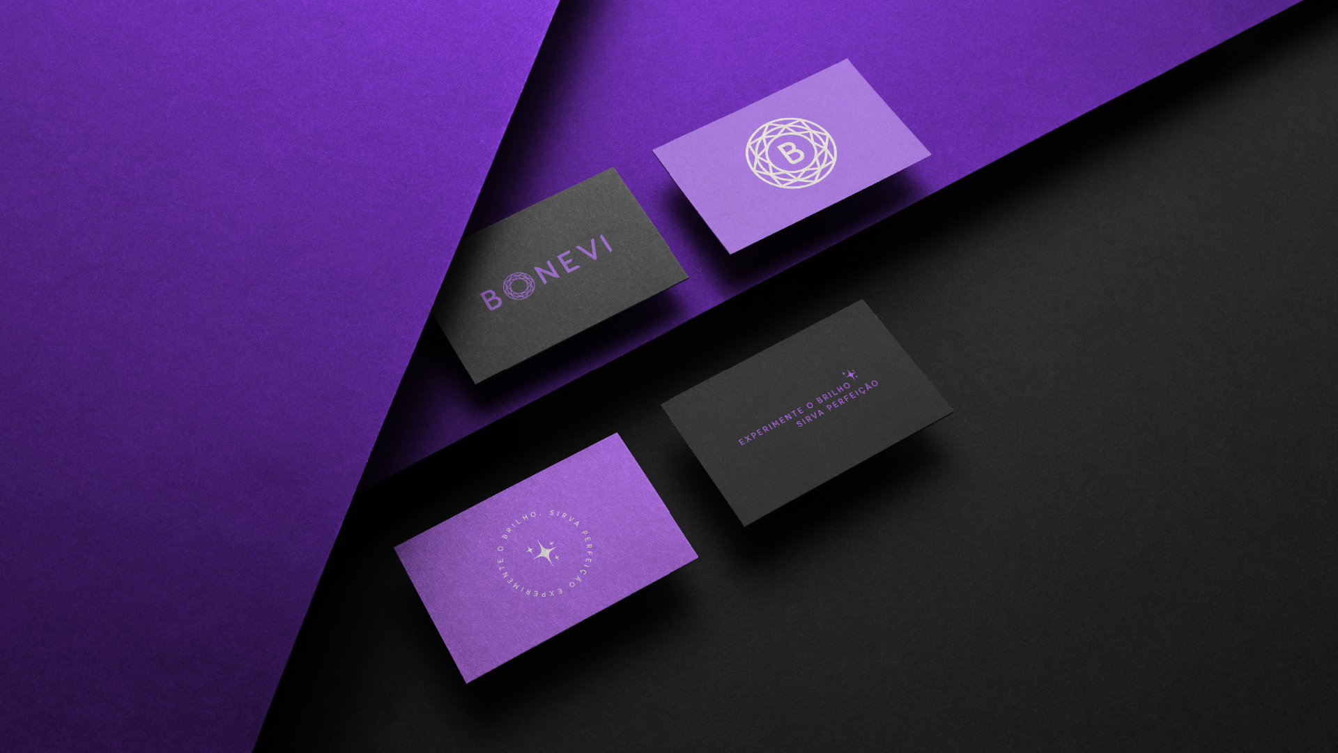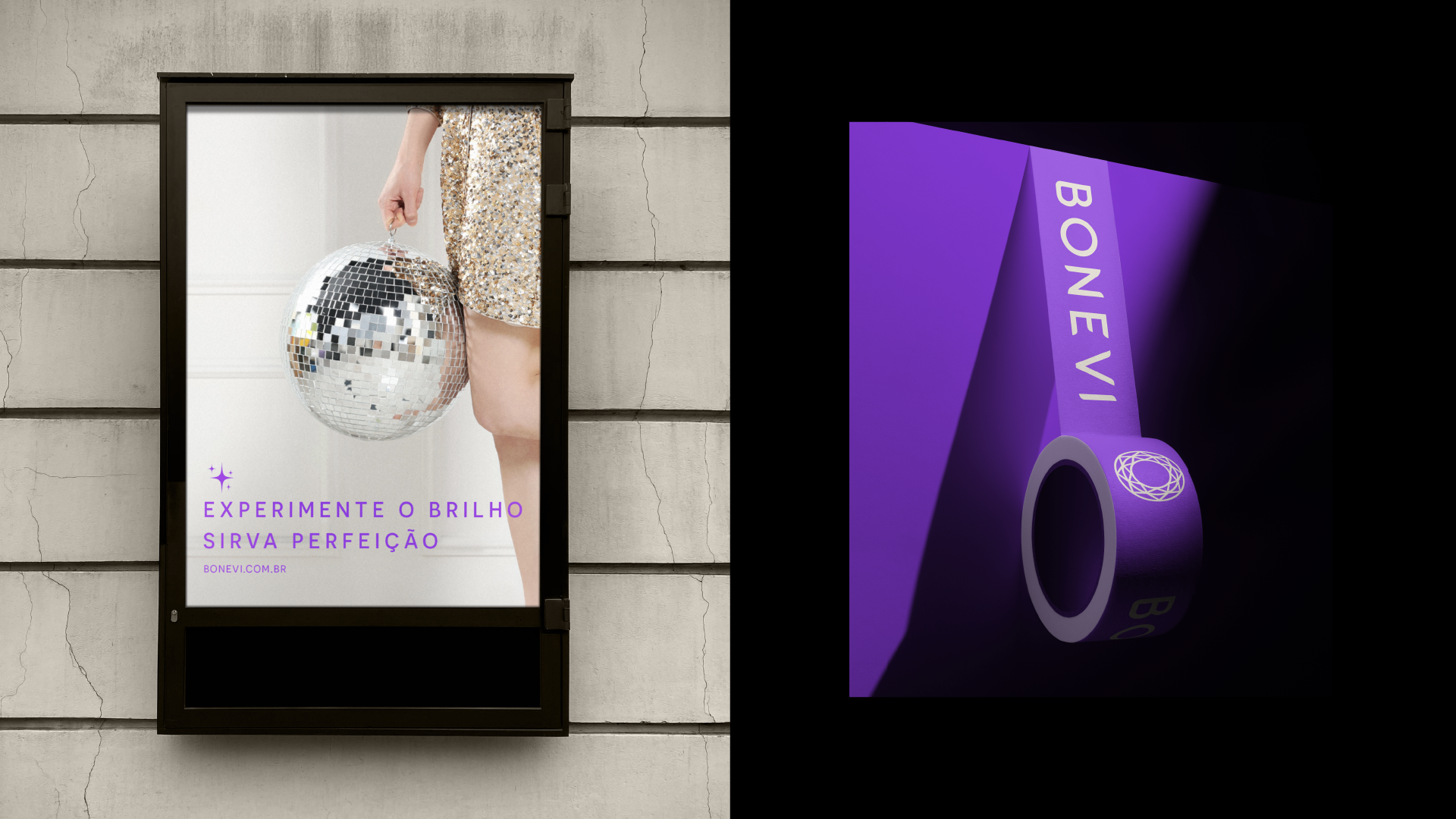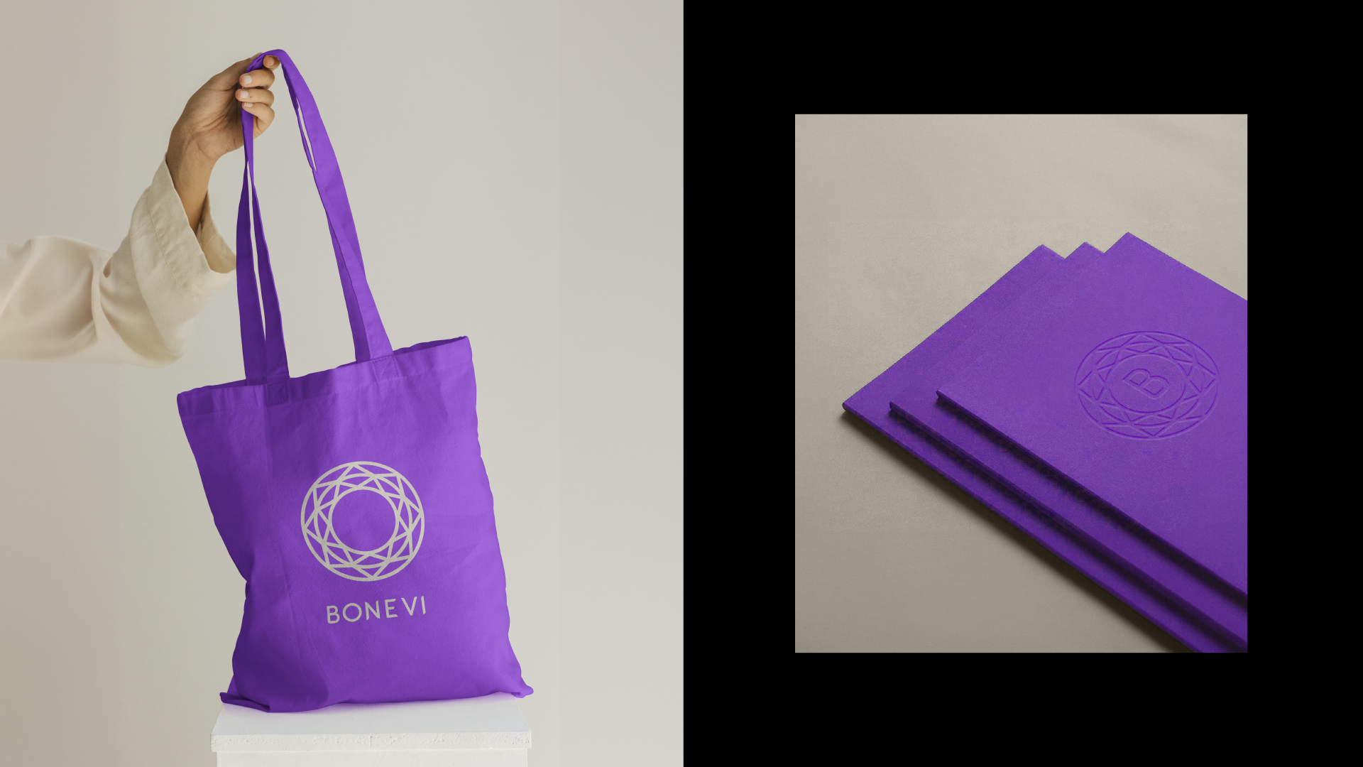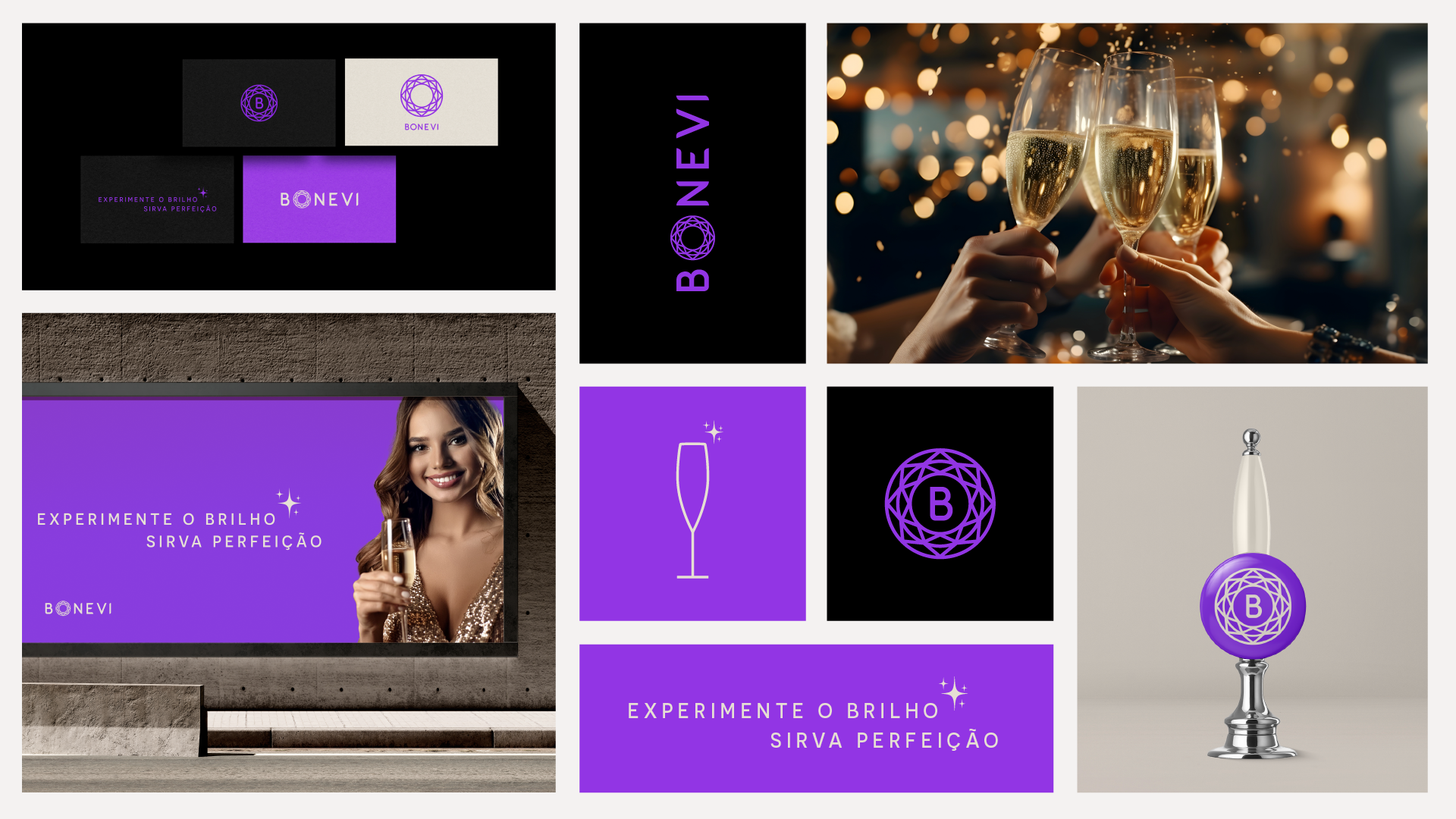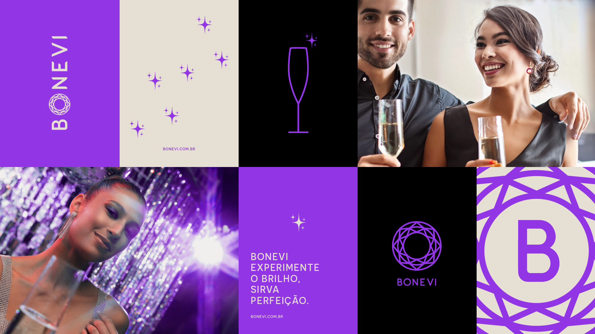 Our strategy began by defining a new brand identity for Bonevi® that aligned with their mission and values right from the inception. We started with a custom logotype designed to capture the essence of luxury and elegance. The diamond facets in the icon symbolize the premium quality of the product, while the contemporary font reflects modernity and sophistication. The choice of a lilac color scheme adds a touch of femininity and magic, appealing directly to Bonevi's target demographic. Beyond visual aesthetics, we focused on crafting a comprehensive visual identity system. This system was applied consistently across all touchpoints, from packaging to advertising. The goal was to ensure that every interaction with the brand evoked a sense of luxury and exclusivity. For instance, the packaging design was developed to reflect the brand's upscale positioning, incorporating sleek lines and premium materials. Additionally, we developed a strategic messaging framework that emphasized the experiential aspect of Bonevi®. Rather than just promoting a product, we highlighted the moments and emotions associated with enjoying Bonevi®, positioning it as more than just a drink but a lifestyle choice for discerning consumers.