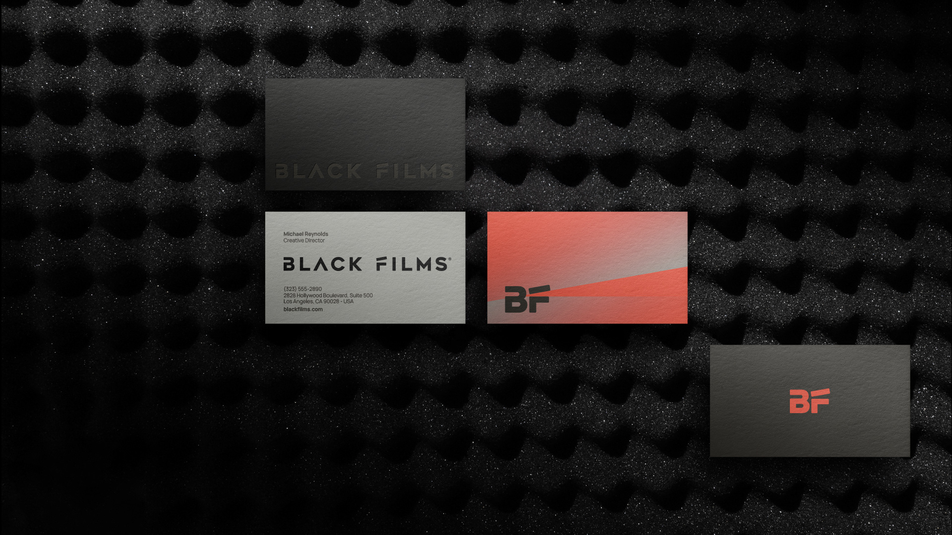 Our branding system extends beyond the logo. It includes business cards, packaging, promotional materials, and merchandise—all consistently reflecting Black Films’ identity.