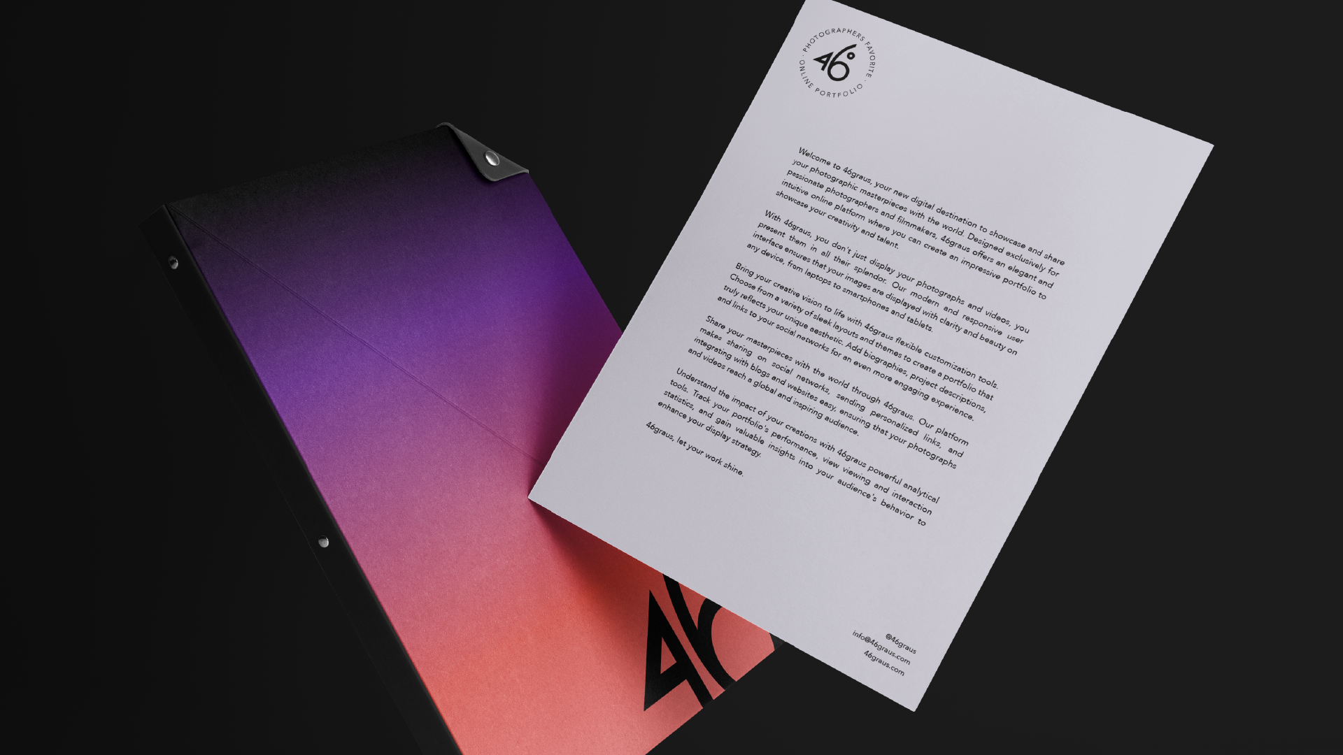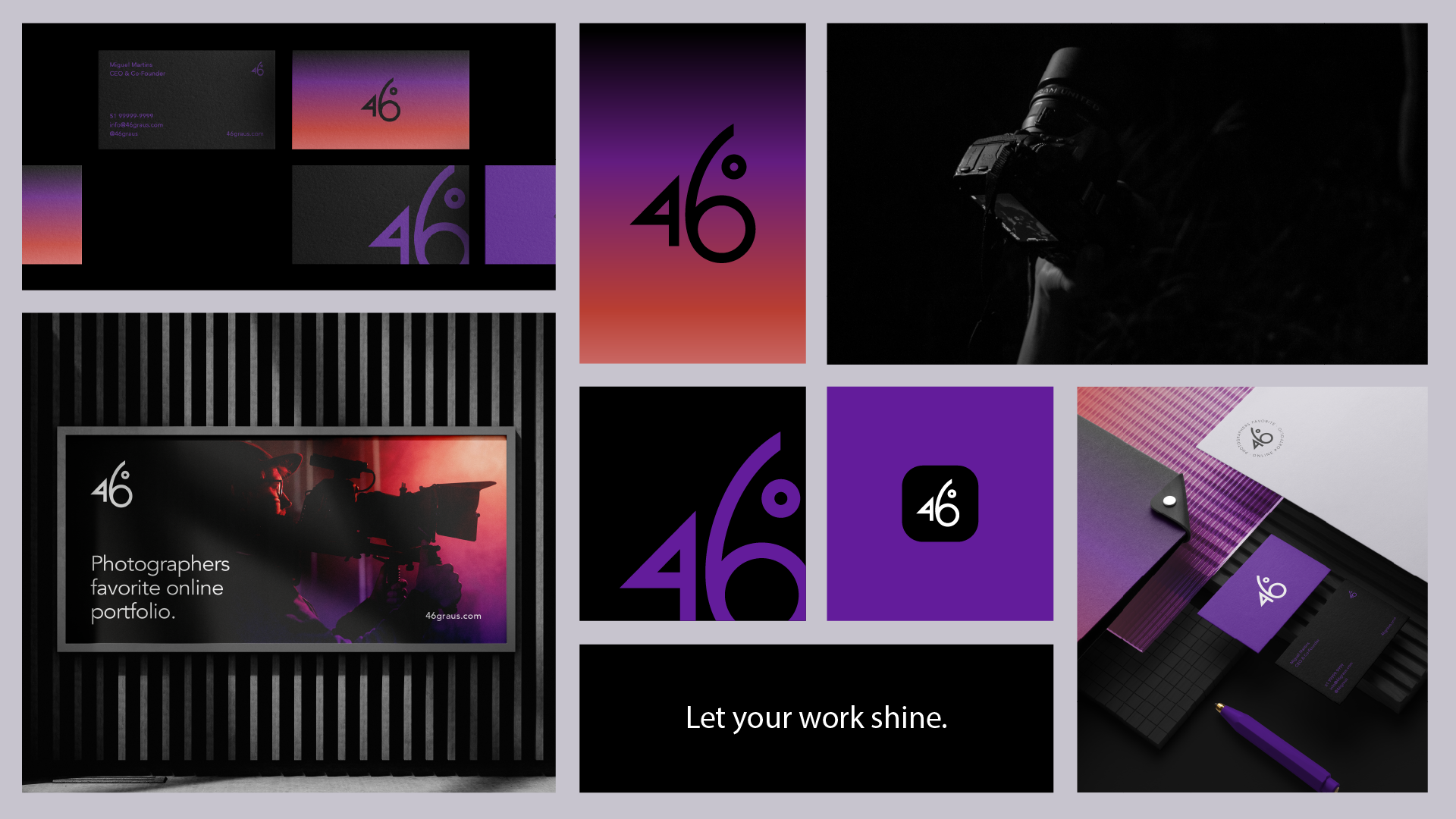 To address these challenges, we developed a comprehensive branding solution rooted in modernity, minimalism, and exceptional user experience. Our approach centered on placing photographs at the heart of the user journey, ensuring they remained the central focus of the platform. We designed a distinctive logo creatively incorporating the number "46º," symbolizing the angle of visual storytelling. The carefully curated color palette included black, white, gray, purple, red, and an original gradient, meticulously chosen to highlight photographs and lend a sleek, sophisticated aesthetic to the platform.