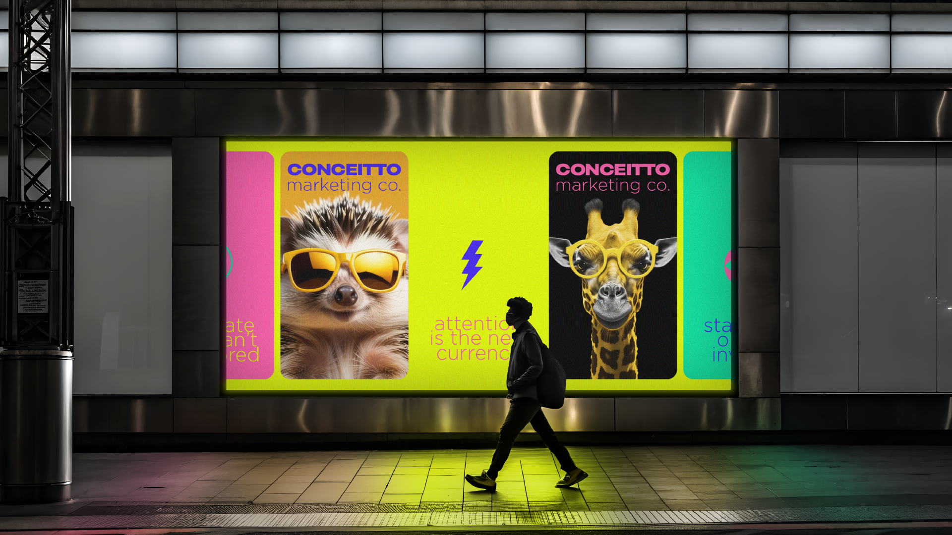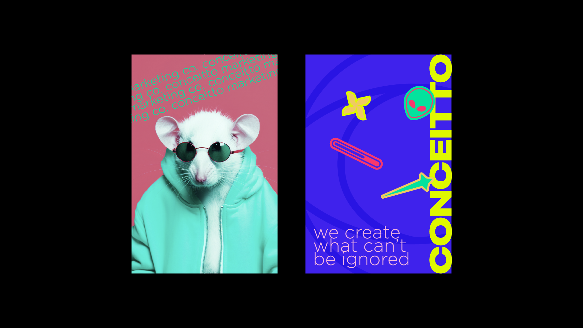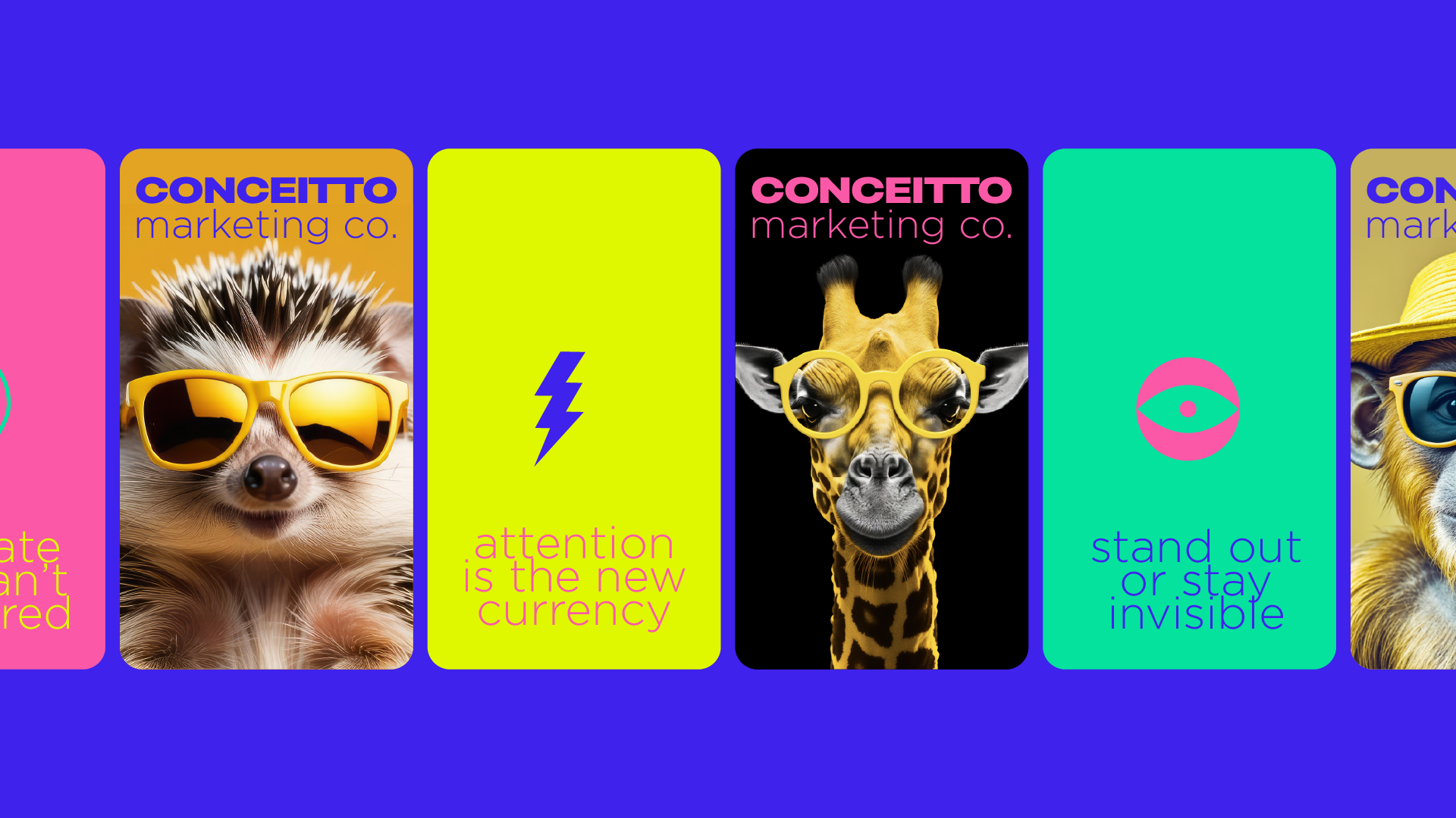 The new identity embraces a palette of neon pink, electric purple, lime green and sunshine yellow—colors chosen to evoke energy, creativity and optimism. This palette allows Conceitto to stand out in crowded feeds and on city streets, communicating its message even at a glance. Bold sans‑serif typography anchors the system; Phrases such as “Attention is the new currency,” “Stand out or stay invisible,” and “We create what can’t be ignored” are used across collateral to reinforce the agency’s provocative mission. A suite of playful illustrations—lightning bolts, googly-eyed aliens, retro pins and stylized animals in sunglasses—injects humor and warmth while hinting at the unexpected ideas Concept brings to its clients.