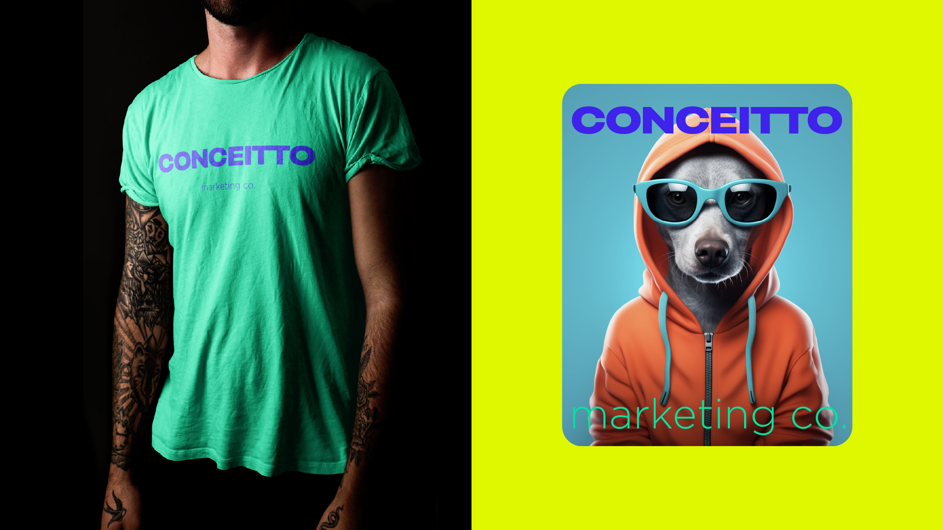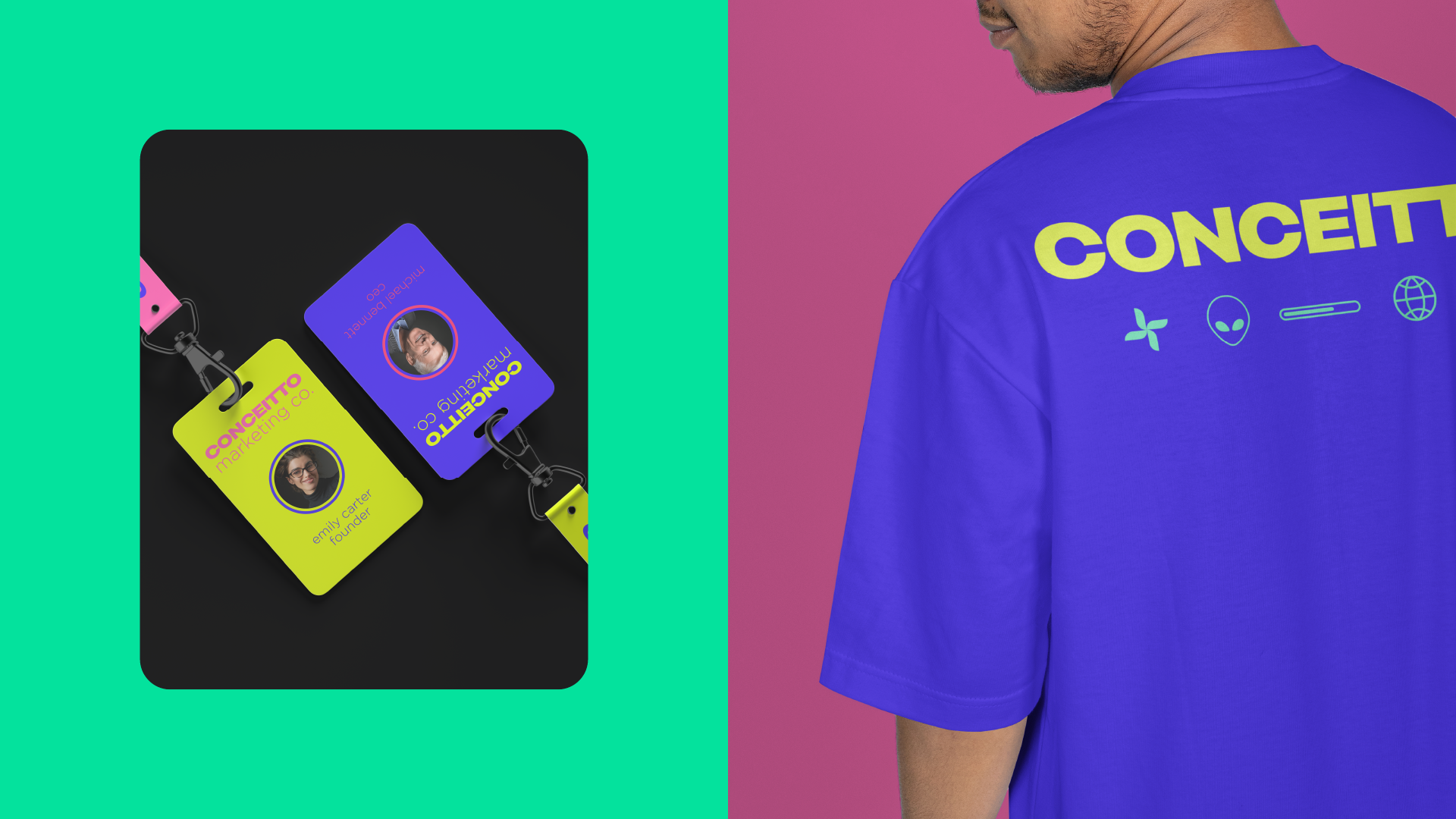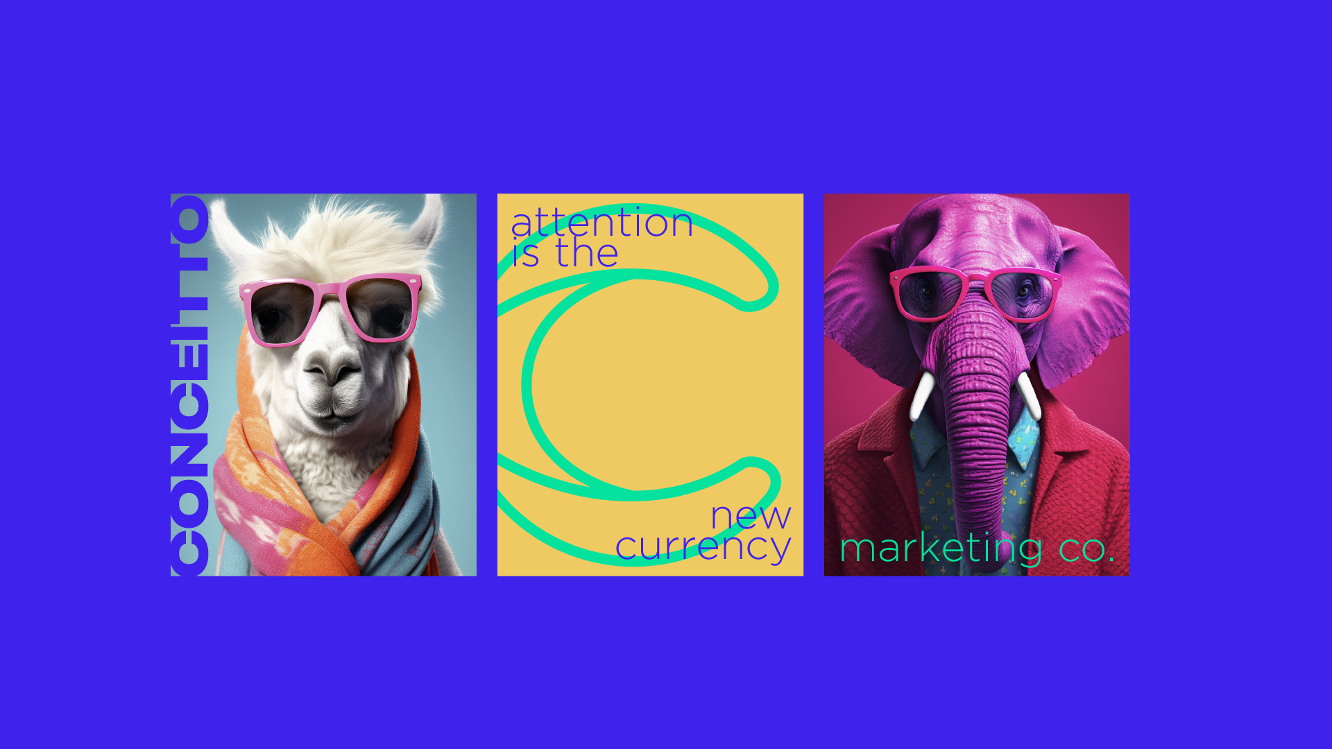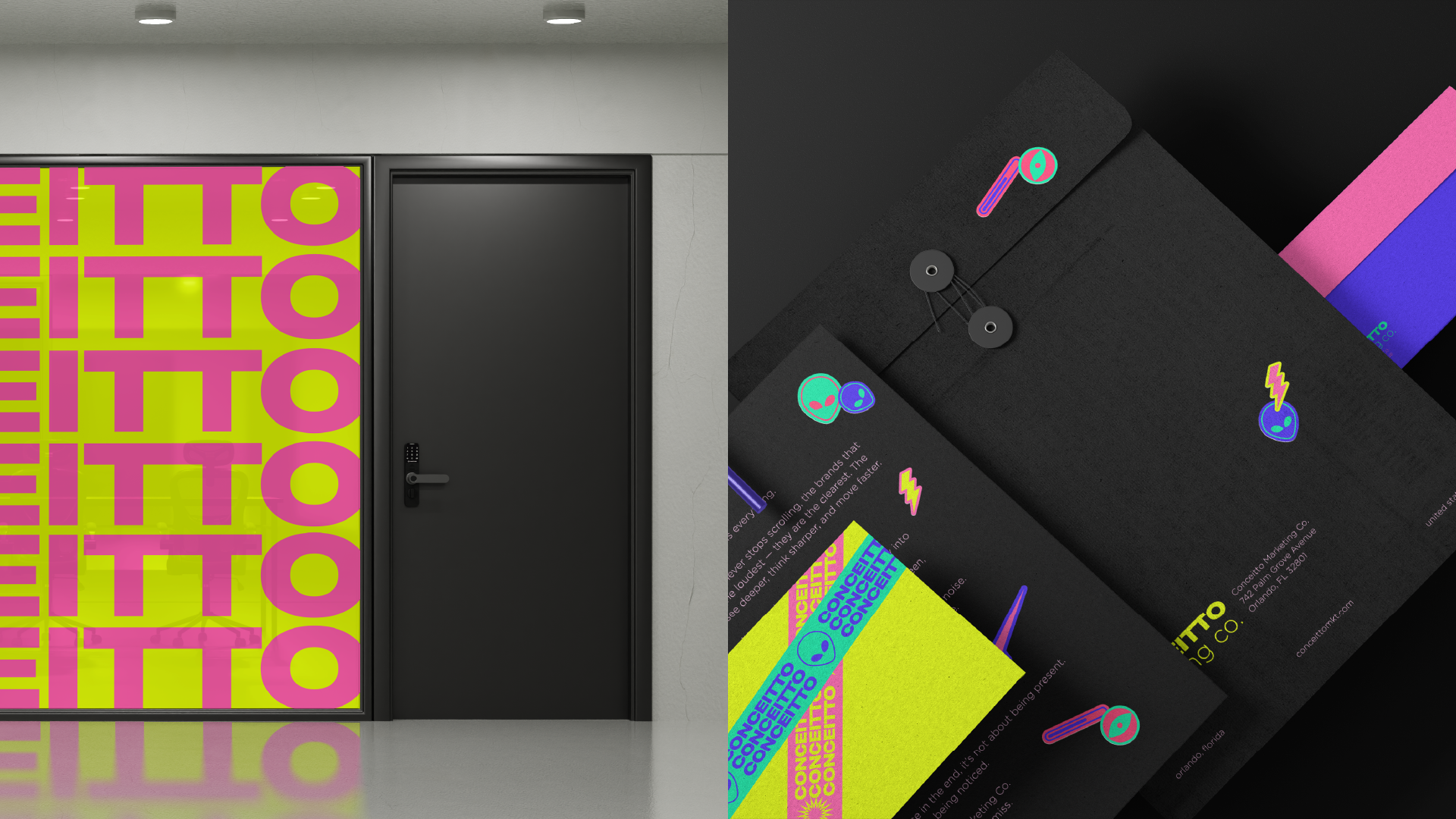 The new identity embraces a palette of neon pink, electric purple, lime green and sunshine yellow—colors chosen to evoke energy, creativity and optimism. This palette allows Conceitto to stand out in crowded feeds and on city streets, communicating its message even at a glance. Bold sans‑serif typography anchors the system; Phrases such as “Attention is the new currency,” “Stand out or stay invisible,” and “We create what can’t be ignored” are used across collateral to reinforce the agency’s provocative mission. A suite of playful illustrations—lightning bolts, googly-eyed aliens, retro pins and stylized animals in sunglasses—injects humor and warmth while hinting at the unexpected ideas Concept brings to its clients.