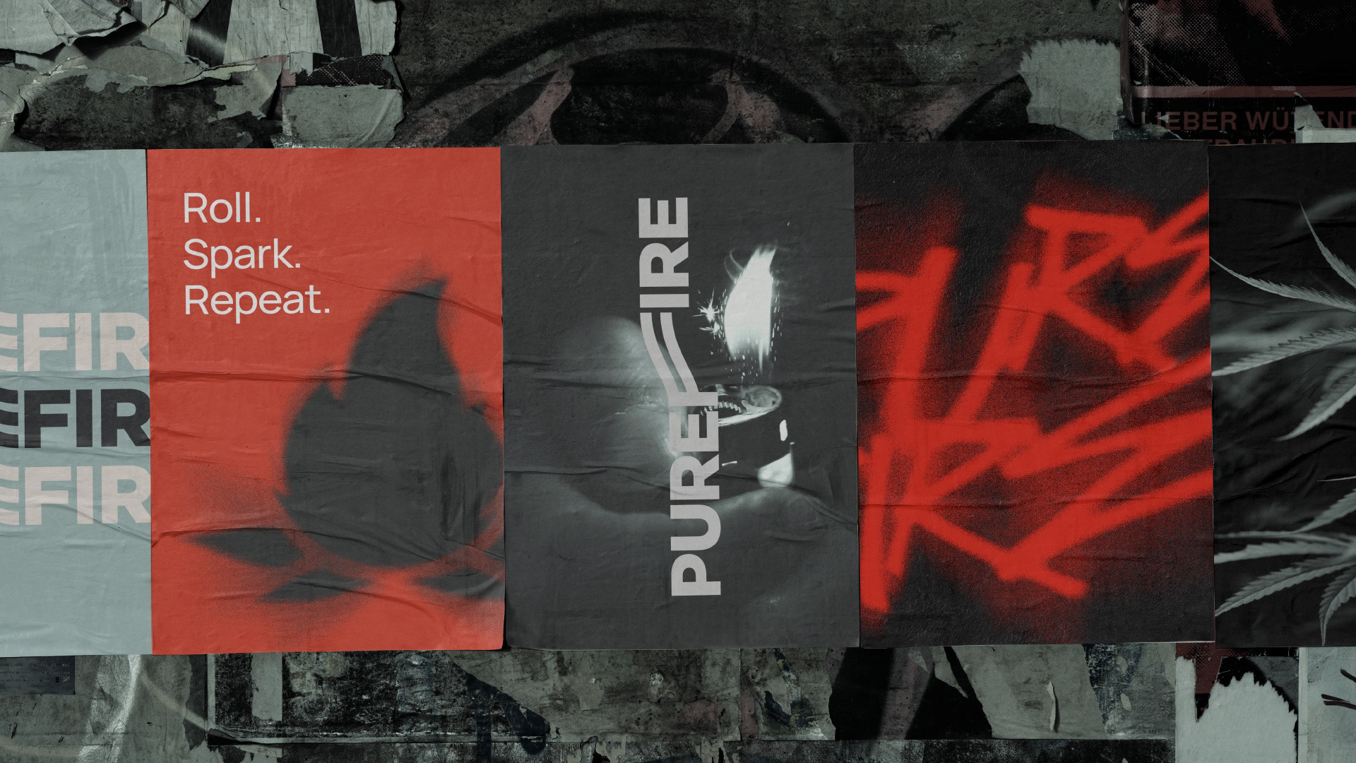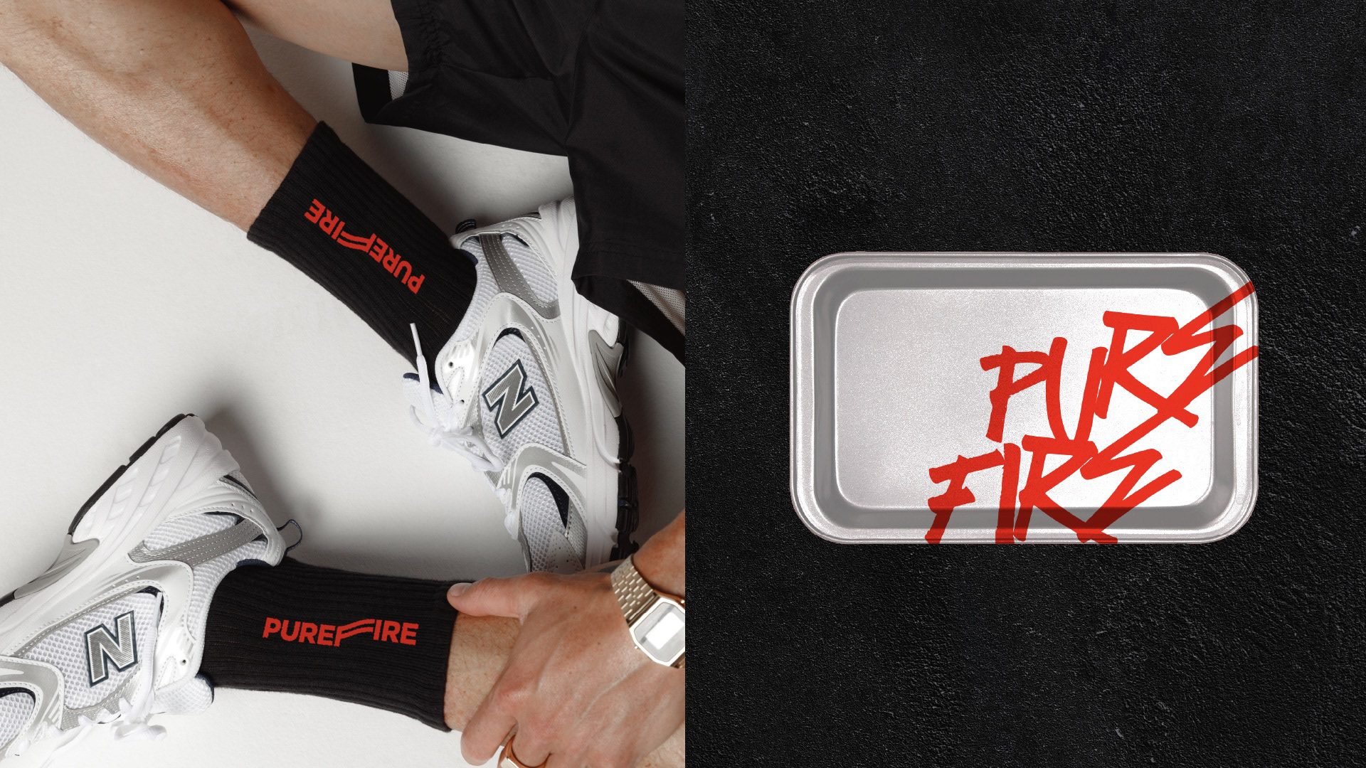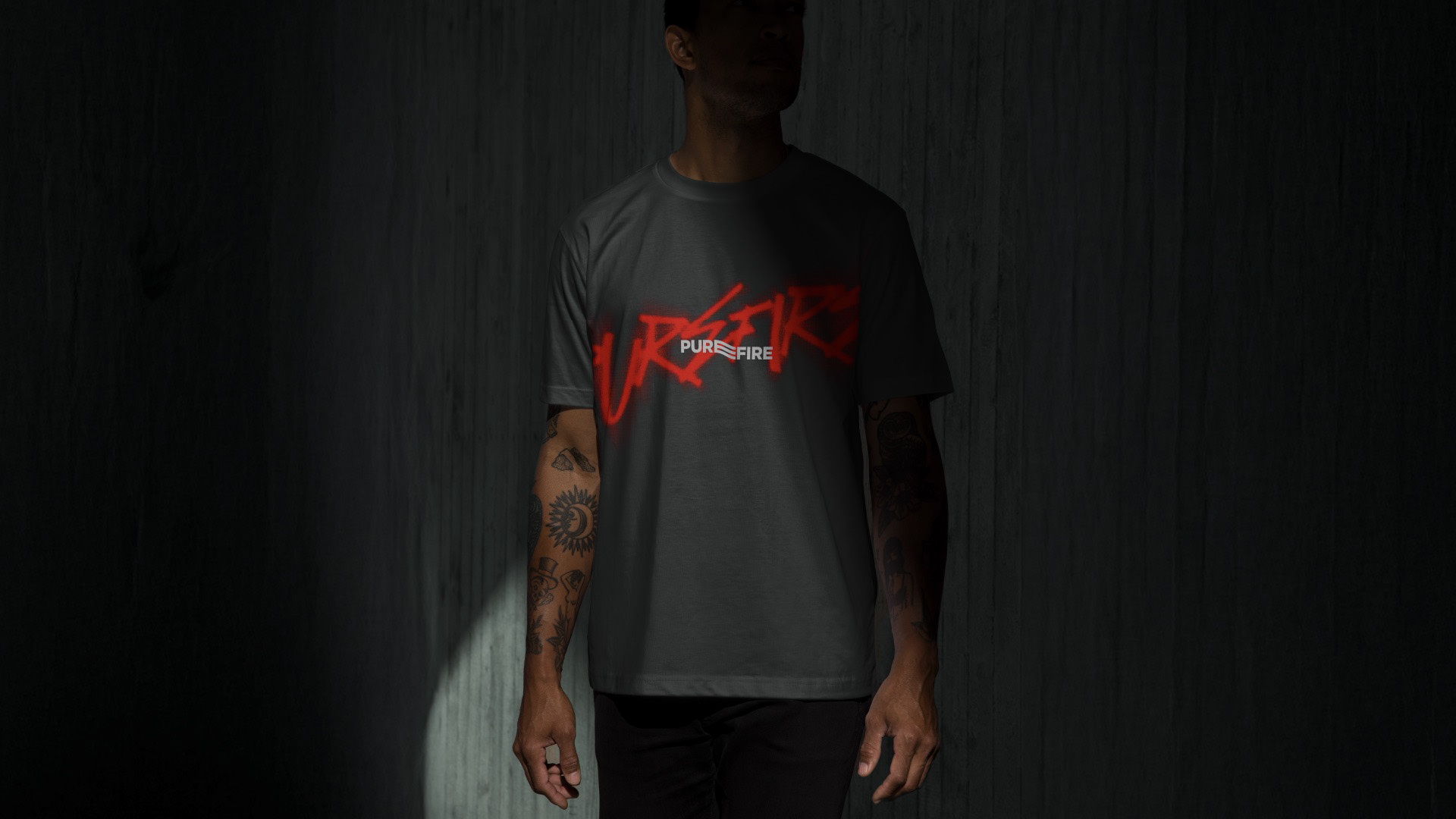 The visual language balances structure with expressive energy. A minimal typographic foundation provides clarity and scalability, while red graffiti overlays inject cultural immediacy and edge. High-contrast photography and black-and-white textures amplify the urban dimension, grounding PUREFIRE® firmly within contemporary street culture.